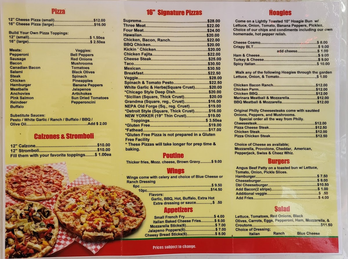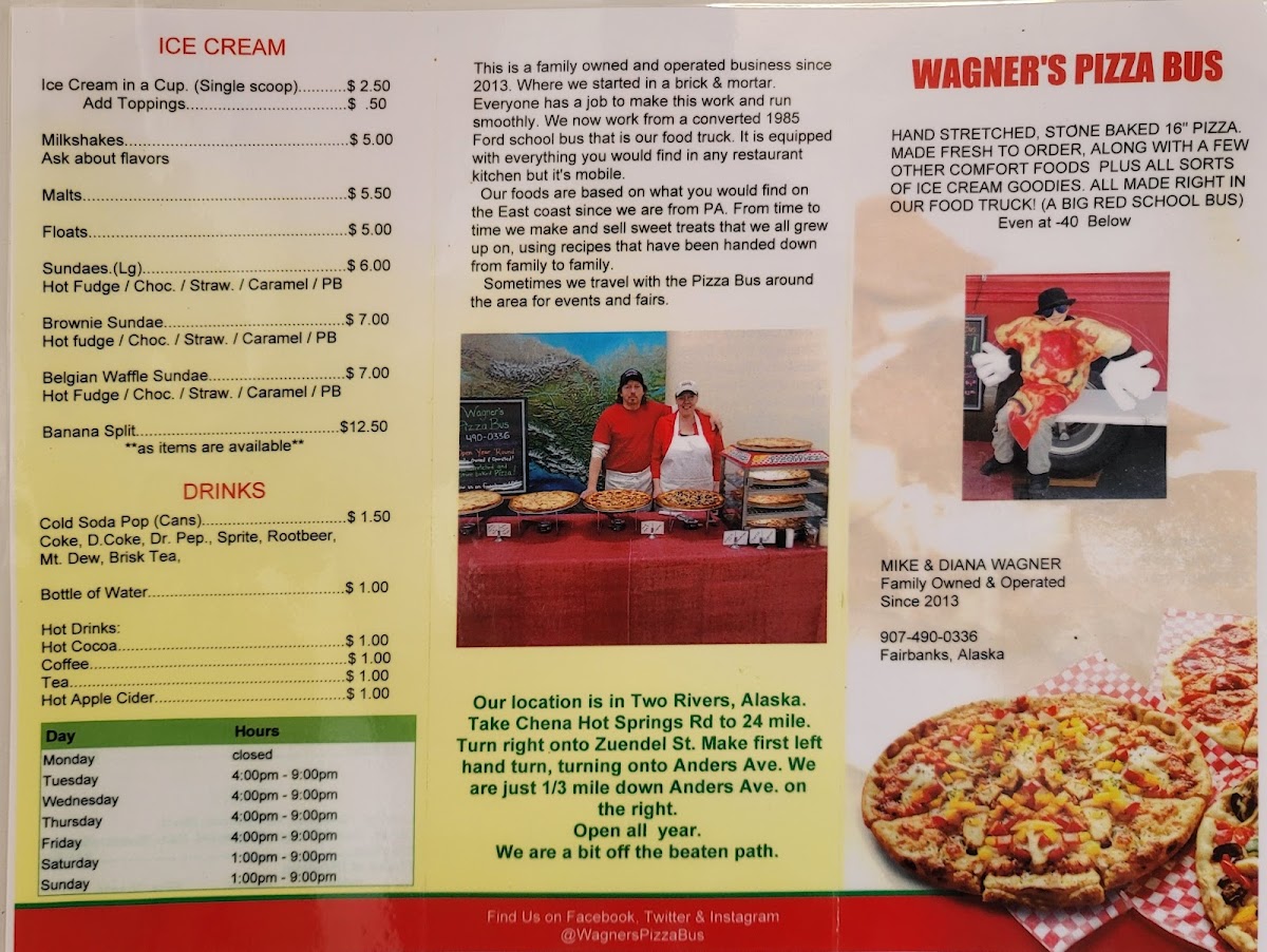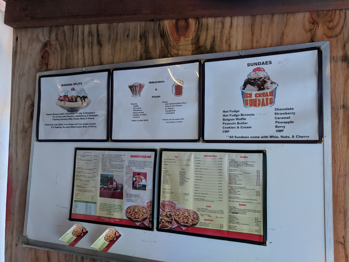 From a reviewer’s perspective, Wagner’s Pizza Bus offers a satisfyingly diverse and casual menu that leans heavily into comfort food favorites. The standout options are the hearty 16" signature pizzas like the Supreme, Three Meat, Four Meat, Hawaiian, and Chicken Bacon Ranch, all of which deliver generous toppings and bold flavors. Beyond pizza, the 12" Calzone and 12" Stromboli provide great alternatives for those craving something folded and filling. The appetizer selection-including Mozzarella Sticks, Jalapeno Poppers, and Cheesy Bread Sticks-pairs well with the main dishes, while sandwiches like the Crispy BLT, Spicy Italian, and Chicken Bacon Ranch Hoagie add even more variety. Classic comfort continues with burgers such as the Cheeseburger and Double Cheeseburger, and lighter options like the Large Loaded Salad are available too. To finish, the dessert and drink menu shines with treats like the Classic Banana Split, customizable Build Your Own Split, and a range of ice cream options including Milkshakes, Malts, and Sundaes. Overall, the menu feels well-rounded and indulgent, making it easy to find something satisfying for any craving.